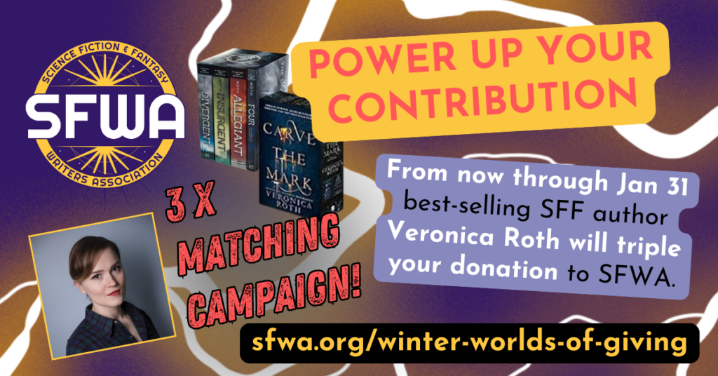 If we raise $3,334 among other SFWA members and the general community, SFWA will be eligible for Veronica Roth’s generous donation of $10,000.