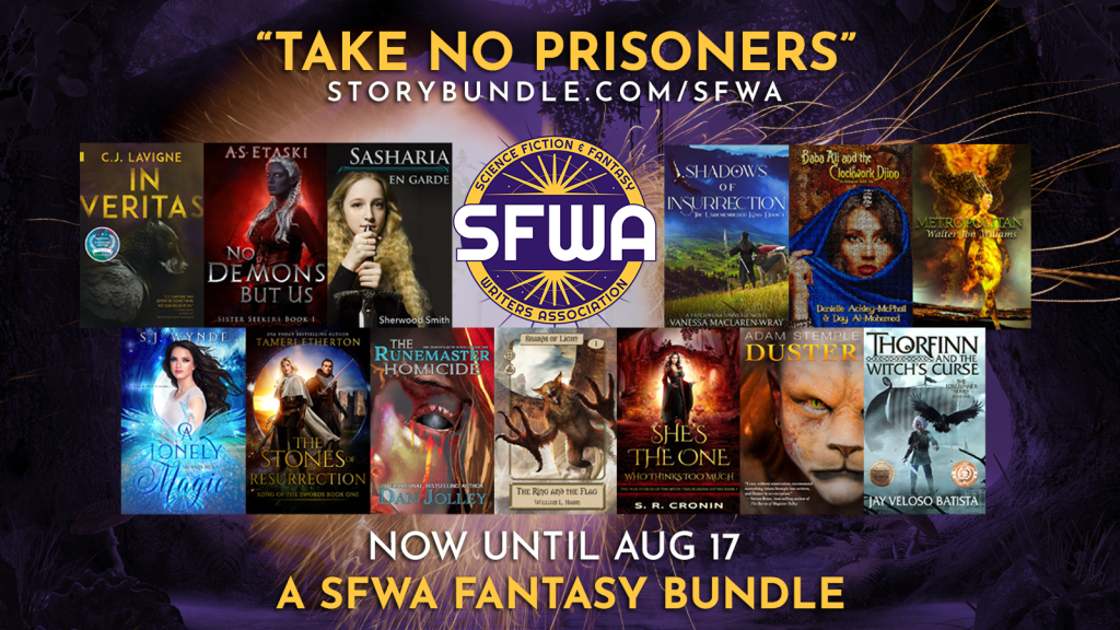 Starting July 27, SFWA’s newest fantasy StoryBundle, “Take No Prisoners,” is available for purchase! This StoryBundle offers a large selection of ebooks from independent and small press fantasy writers at one low price, and can be purchased at https://storybundle.com/sfwa. It’s only available for a limited time, so make your purchase before August 17!