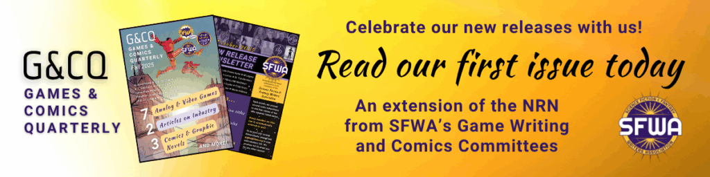 Your stand-alone published work can be any type of game (tabletop, card, RPG, video game) or comic/graphic novel format, so long as it’s in the speculative fiction genre. Indie and traditionally published works alike are welcome. Nonfiction related to SFF gaming or comics (e.g., a history of X) is also eligible for listing, both here and in NRN. SFWA reserves the right to refuse any title.
