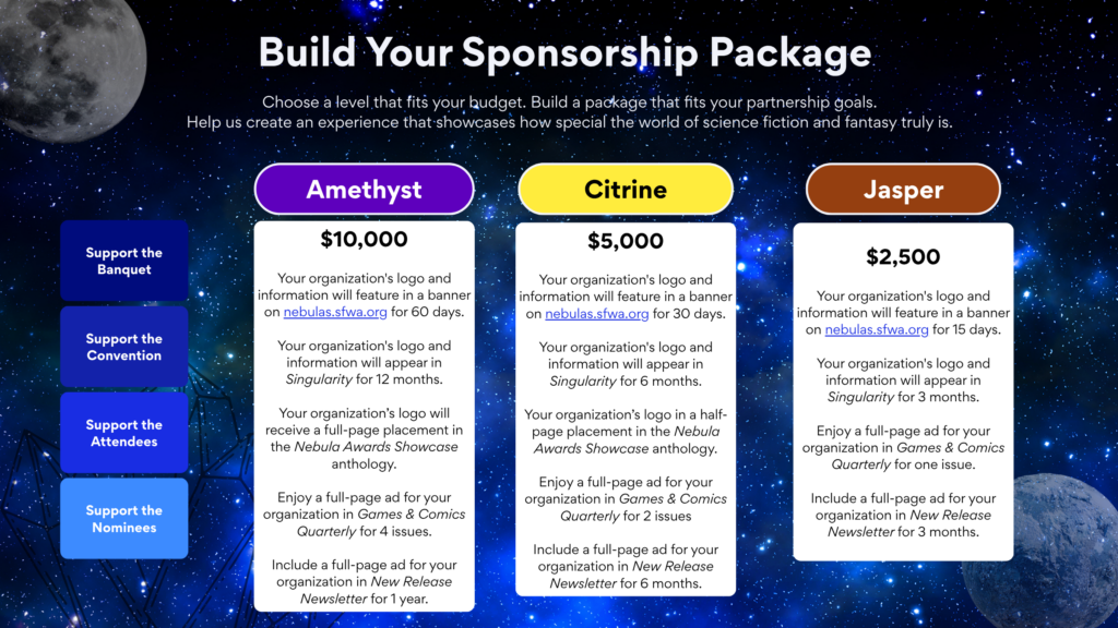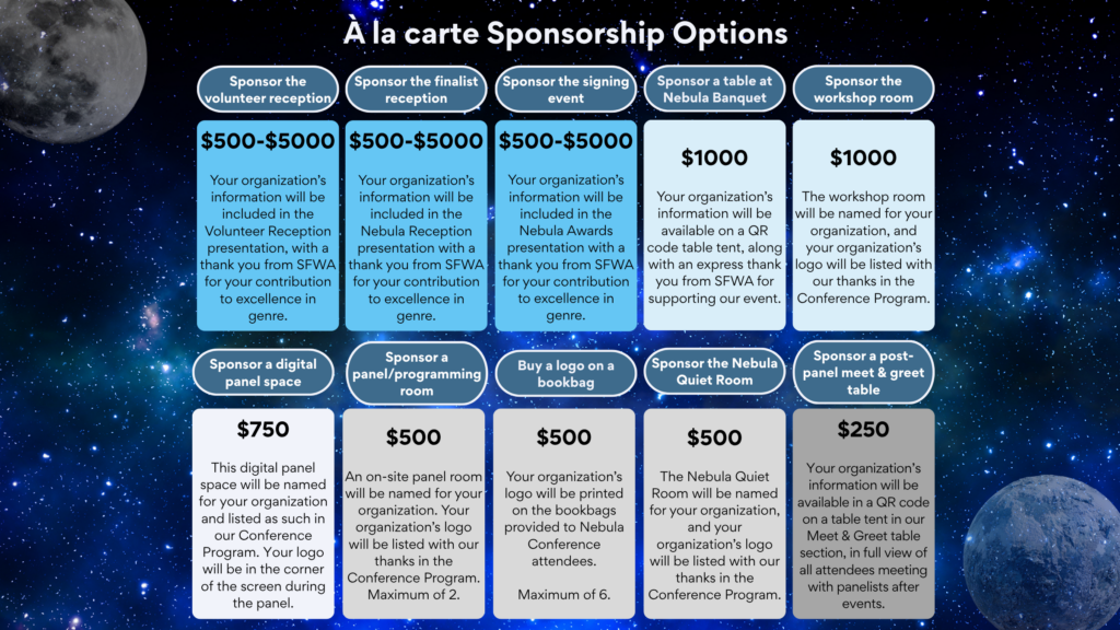 Let’s talk! Write to nebulasponsorship@sfwa.org to find exactly the right sponsorship package for your organization’s needs today.