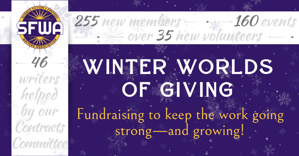 Interested in a recurring donation so you can support SFWA throughout the year? You can select a subscription here – and thank you, because recurring monthly donationsare the most effective way to support any nonprofit!